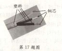 17. “护套线”是一种家用电线,由铜芯和塑料层组成(如图所示)。其中的(选填“铜”或“塑料”)是绝缘体;家用空调所用导线的电阻较小,所以它所用电线的铜芯要(选填“粗”或“细”)一些。