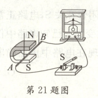 21. 如图所示为探究“产生感应电流条件”的实验装置,闭合开关,导体$AB$(选填“左右”“上下”“沿$A$向$B$”或“沿$B$向$A$”)运动时,电流表的指针会发生偏转;若保持导体$AB$不动,要产生感应电流,正确的操作是。