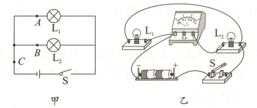 (1)由图乙可知,两个支路一条是$L_{1}$单独接入,另一条支路是$L_{2}$和电流表,所以电流表测量通过$L_{2}$的电流。