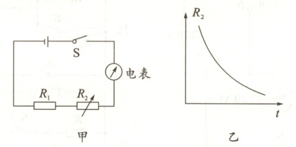 10. 小明有一个可以显示水温的“智能水杯”。为了研究“智能水杯”内部的电路,小明设计了如图甲所示的电路来模拟“智能水杯”的功能。其中$R_1$为定值电阻,热敏电阻$R_2$的阻值随温度的变化关系如图乙所示,电源电压不变,图甲中电表的示数可以反映温度的高低。当温度升高时()