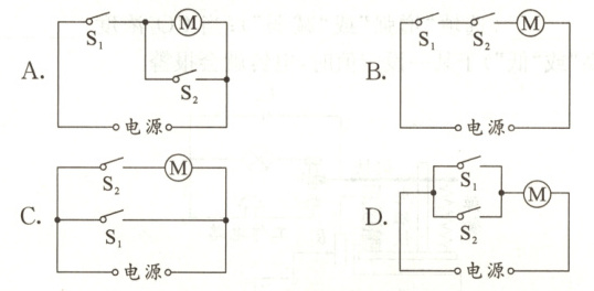 9. 《成都市非机动车管理条例》自2024年6月1日实施以来,骑行人员佩戴头盔的越来越多。小佳想制作一款智能头盔,只有戴上头盔扣上卡扣后,头盔上的信号发射器才能发出信号,电动车上的信号接收器接收到信号控制$S_1$闭合,再转动电动车钥匙(相当于$S_2$闭合),车才能正常启动,下列电路中符合要求的是()