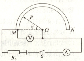 4. 如图所示是跨科学学习团队设计的电子“量角器”的电路原理图,电源电压恒为4 V,定值电阻$R_0$的阻值为8 Ω。电流表的量程为0~0.6 A,电压表的量程为0~3 V,MN是一段阻值为30 Ω的半圆弧形电阻,O为半圆弧的圆心,金属滑片OP为半径,且与半圆弧接触良好。半圆弧接入电路的电阻$R_{MP}$与指针旋转角度θ成正比。所测角度θ越大,“量角器”显示角度的仪表示数越大。下列说法正确的是()