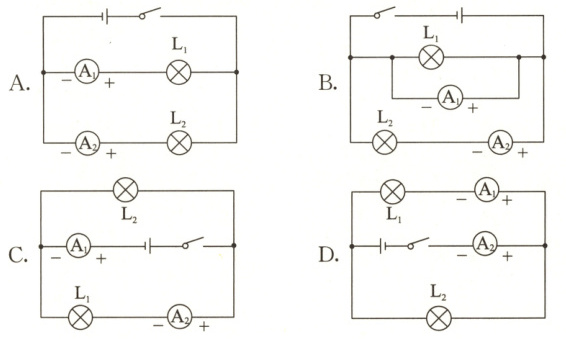 4. 用电源、开关、电流表、灯泡组成图中4个不同的电路。开关闭合后, 电流表A₁能直接测量通过灯泡L₁电流的是 ()