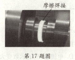17. “摩擦焊接” 由于效率高、质量好在制造业中获得广泛应用 (如图所示)。它利用工件端面相互摩擦, 使工件的内能 (选填 “增大” 或 “减小”), 该过程的能量转化方式与四冲程内燃机的冲程相同。