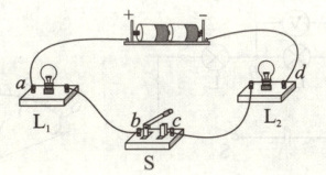 3. 如图所示是小明连接的电路, 他检查导线连接无误后, 闭合开关S, 发现两灯均不发光, 于是他用一根导线分别连接ab、bc、cd和ac, 灯泡L₁、L₂均不发光, 再用导线连接bd时, 灯泡L₁发光, L₂不发光, 由此判定电路的故障是 ()