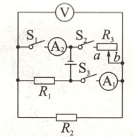 5.BC 解析:A、B只闭合开关$S_{2}$时,$R_{1}、$$R_{2}、$$R_{3}$串联,电阻$R_{1}$与$R_{2}$阻值相同,都设为R,滑动变阻器$R_{3}$的滑片位于中点,滑动变阻器接入电路的阻值为$\frac{R_{3}}{2},$电压表V示数为2V,此时电源电压$U=\frac{2V}{R}(2R+\frac{R_{3}}{2})①;$开关$S_{2}、$$S_{3}$闭合,$S_{1}$断开时,电流只经过$R_{3},$电流表$A_{1}$示数为0.2A,此时电源电压$U=0.2A×\frac{R_{3}}{2}②;$将$R_{3}$的滑片移到b端,三个开关都闭合时,$R_{1}、$$R_{2}、$$R_{3}$并联,电流表$A_{2}$示数为0.4A,此时电流表测的是通过$R_{1}$和$R_{2}$的总电流,$R_{1}$与$R_{2}$阻值相同,所以此时通过$R_{1}$与$R_{2}$的电流都是0.2A,电源电压U=0.2A×R③;则$0.1A×R_{3}=0.2A×R,$$R_{3}=2R,$把$R_{3}=2R$代入①得,U=6V,再把U=6V代入②得,$R_{3}=60\Omega,$$R_{1}=R_{2}=R=30\Omega,$故A错误,B正确;C将$R_{3}$的滑片移到b端,三个开关都闭合时,$R_{1}、$$R_{2}、$$R_{3}$并联,电流表$A_{2}$示数为0.4A,电路消耗的总功率为$P_{1},$$I_{1}+I_{2}=0.4A,$$I_{3}=\frac{U}{R_{3}}=\frac{6V}{60\Omega}=0.1A,$此时干路电流$I=I_{1}+I_{2}+I_{3}=0.4A + 0.1A=0.5A,$电路消耗的总功率$P_{1}=UI=6V×0.5A=3W,$故C正确;D开关$S_{1}、$$S_{2}$闭合,$S_{3}$断开时,电流只经过$R_{1},$电路消耗的总功率$P_{2}=\frac{U^{2}}{R_{1}}=\frac{(6V)^{2}}{30\Omega}=1.2W,$故D错误。故选BC。