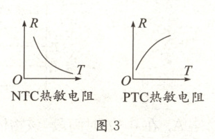 (2)小李用电话手表与爷爷长时间视频通话, 手表突然自动关机, 原因是手表过热, 启动了保护功能。她认为手表启动保护功能一段时间后, 应有自动开机功能, 于是她用所学知识设计出模拟热保护装置的示意图(如图 2 所示), $R_{0}$ 为定值电阻, $R$ 为热敏电阻(有两种类型可供选择, 其电阻随温度变化关系如图 3 所示, $R$ 的温度变化主要受发热元件影响)。下列分析合理的是