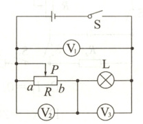3. 如图所示, 电源电压为 $4.5 \mathrm{~V}$ 且恒定不变, 当开关 S 闭合后, 滑动变阻器的滑片 $P$ 从 $a$ 端滑向 $b$ 端的过程中, 三只理想电压表的示数变化的绝对值分别为 $\Delta U_1 、 \Delta U_2 、 \Delta U_3$, 下列可能出现的情况是 ()