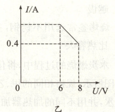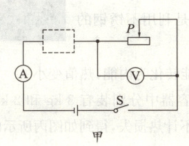 4. 如图甲所示的电路中, 电源电压恒为 $12 \mathrm{~V}$、电流表 ($0 \sim 0.6 \mathrm{~A}$)、电压表 ($0 \sim 15 \mathrm{~V}$)、滑动变阻器标有 “? $\Omega 1 \mathrm{~A}$” 字样, 虚线框内是一个定值电阻或是一个规格为 “$6 \mathrm{~V} 0.5 \mathrm{~A}$” 的小灯泡 (阻值会随温度变化而发生改变), 闭合开关, 在元件安全的前提下, 使滑片 $P$ 移动范围最大, 得到滑动变阻器的 $I-U$ 图象如图乙所示。则下列说法正确的是 ()