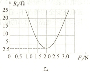 (2)水果符合要求时$U_T\leq3\, V$,由$U_T=\frac{U R_T}{R_0+R_T}\leq3\, V$,解得$R_T\leq20\,\Omega$。由图乙知$R_T$最小值为$2.5\,\Omega$,故$2.5\,\Omega\leq R_T\leq20\,\Omega$。总电阻$R_{ 总}=R_0+R_T$,电流$I=\frac{U}{R_{ 总}}$,功率$P=UI$。