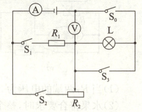 7. (6分)如图所示,电源电压恒定,灯泡L标有“3V 1.5W”字样(忽略温度对灯丝电阻的影响),滑动变阻器铭牌缺失部分参数,仅有“1A”字样。只闭合开关S₀和S₂,将滑动变阻器的滑片滑到中点,此时电流表的示数为I₁;再将滑动变阻器的滑片滑到最右端,此时电流表的示数为I₂;保持滑片位置不动,同时闭合四个开关,电流表的示数为I₃,此时R₁的实际功率为3.6W;已知I₁:I₂=3:2,I₁:I₃=5:11。