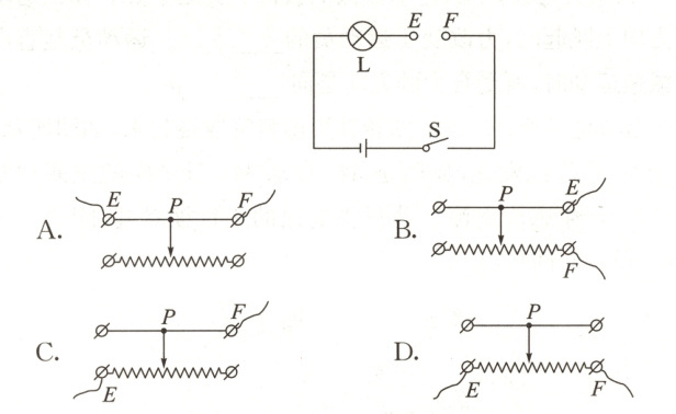 11. 小聪设计了利用滑动变阻器改变灯泡亮度的电路图,如图所示。在E、F间接入滑动变阻器,闭合开关,当滑片$P$向左滑动时,灯泡变暗。下列四种接入方式,符合要求的是 (