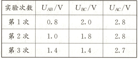 (3)分析表中数据,在误差允许的范围内,比较AB间、BC间、AC间的电压值可得:串联电路中总电压等于各部分电路电压之和,故D正确。
