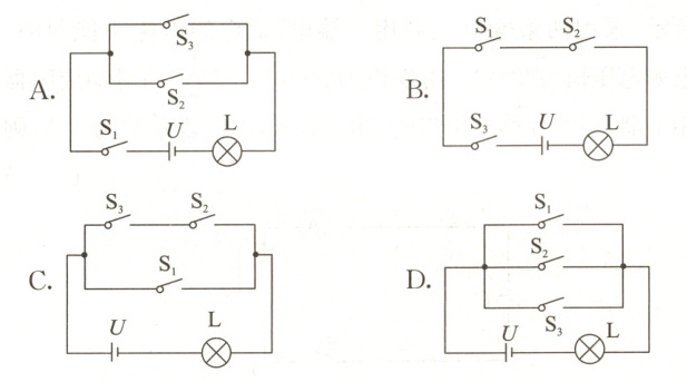 8. 某智能烧水壶工作方式有两种,必须先闭合电源开关S₁,再闭合按键S₂或语音S₃,烧水壶才能工作。用灯泡发光模拟烧水壶工作,则下列设计的电路图符合要求的是 (