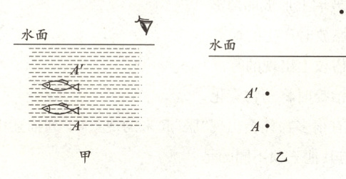20. (2分)如图所示,图甲是人在岸边观察水中鱼时的情景,在图乙中完成光路图。(其中A表示鱼的位置,A'表示鱼像的位置,B表示人眼位置,可以不画法线,保留作图痕迹)