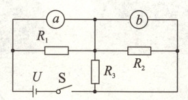 18. 如图所示,当a处接电流表,b处接电压表,闭合开关S,电路总功率为P₁;当a、b两电表互换位置后,再闭合开关S,电路总功率为P₂。已知U=6 V,R₁=20 Ω,R₂:R₃=1:3,P₁:P₂=4:3,则R₂的阻值为
