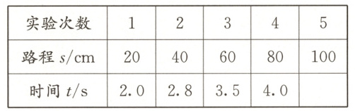 (2)根据表格数据知,每次路程都增大$20 cm$,而时间增大为$0.8 s$、$0.7 s$、$0.5 s$、$0.4 s$;即相同路程所用时间越来越短,因而速度越来越快,做加速直线运动。
