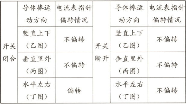 分析表中信息可知,导体在磁场中运动产生感应电流的条件:闭合电路的一部分导体在磁场中做