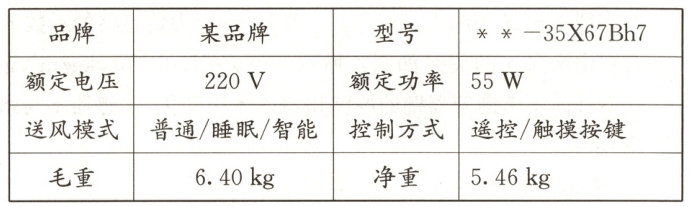 (2)电风扇的额定电流$I_{额}=\frac{P_{额}}{U_{额}}=\frac{55 W}{220 V}=0.25 A$;