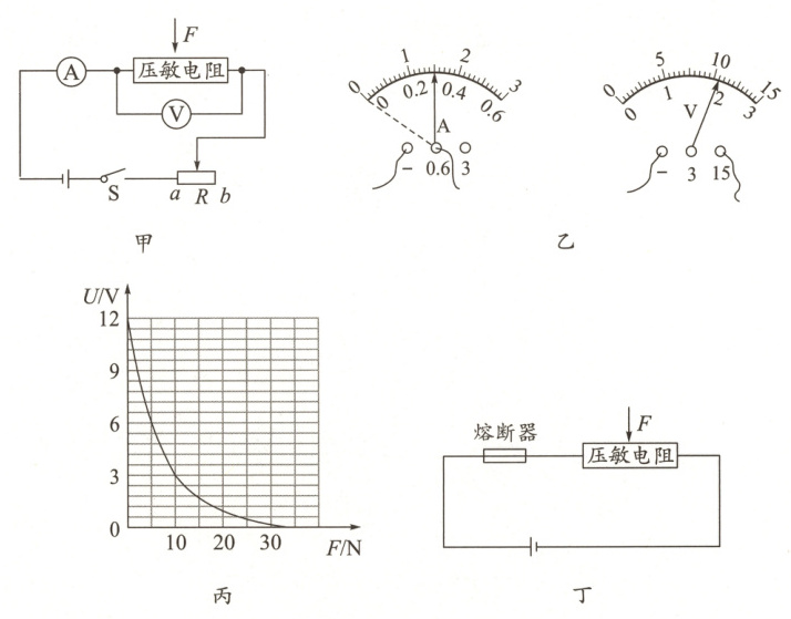 (5)实验后,学习小组将该压敏电阻与电阻丝熔断器、电源构成串联电路,如图丁所示,电源电压恒为12V,电阻丝熔断器的熔断电流为0.8A。若要该压敏电阻受到的压力增加到10N时熔断器的电阻丝熔断,则熔断器的阻值应设计为