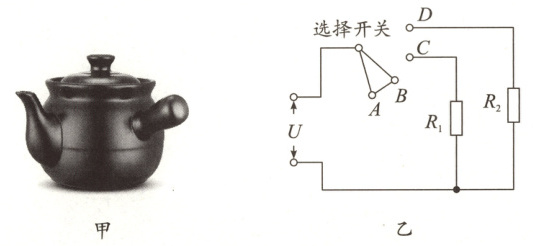 27. (10分)中医药是中国传承几千年的文化瑰宝。如图甲所示是一款小型的电热中药煎药壶,额定电压为220V,有高温、低温两个挡位,其内部简化电路如图乙所示,当双触点选择开关接触A、B时为断开状态。R₁、R₂是两个阻值不变的电热丝,R₁=484Ω,R₂=121Ω,U=220V。