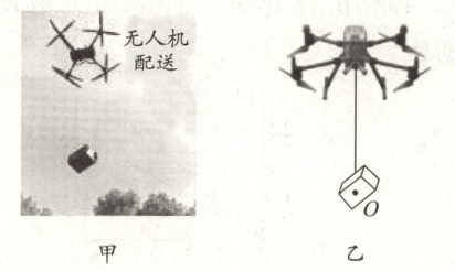 19. (3分)某景区用无人机为各补给点运送生活物资,如图甲所示。生活物资重力为 G、绳子拉力为$F_{拉}$。请在图乙 O 点画出无人机匀速运送中: