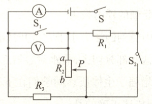 18. 如图所示,电源电压恒为 U。只闭合开关 S,滑片 P 移至 a 端时,此时电压表示数为$U_1$,电流表示数为$I_1$,$R_3$的电功率为$P_1$;滑片 P 移至 b 端,电压表示数为$U_2$,电流表示数为$I_2$,$R_3$的电功率为$P_2$;开关 S、$S_1$和$S_2$全部闭合,滑片 P 仍位于 b 端时,$R_1$的电功率为$P_3$,电流表示数为$I_3$。已知$I_3 = 1.4 A$,$P_3 = 3.6 W$,$U_1 : U_2 = 5 : 8$,$P_1 : P_2 = 25 : 4$。电源电压 U =