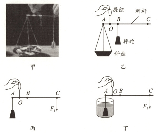 (选填“增大”或“减小”)秤砣质量的方法。(5)该小组设计了一个测量秤砣密度的方案:在图乙中取下秤盘后,A 端悬挂秤砣,在 C 端施加竖直向下的拉力$F_1$时,木棒水平平衡,如图丙所示;把秤砣浸没在一个盛有适量液体的圆柱形容器中,液体深度变化 0.02 m,液体对容器底部压强变化了 160 Pa,在 C 端施加竖直向下的拉力$F_2$时,木棒再次水平平衡,如图丁所示。已知$F_1 : F_2 = 11 : 10$。秤砣密度为