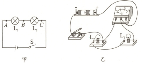 (1)如图乙所示是他们连接的实物电路图,闭合开关,电压表测量两端的电压。