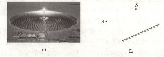 24.$(2$分)如图甲所示,我国敦煌的塔式光热电站通过平面镜把太阳光反射后会聚到吸热塔,为解释这一原理,我们假设$ S$点为太阳,平面镜如此放置时,反射光线刚好可以射到$A$点,请在图乙中完成太阳$ S$发出的光经镜子反射到达吸热器$A$的光路图。