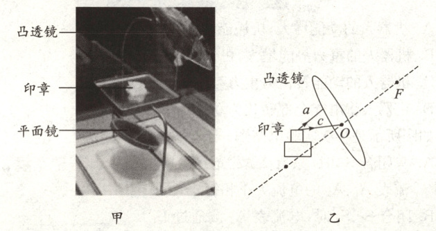 21. (2分)如图甲所示是博物馆内印章的展台,能看到放大的印章也能看到印章底部的字;图乙是其示意图,请在图乙中画出:光线a、c经过凸透镜折射后的光线。