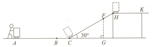 4. 工人把重为$200\ N$的有轮子的箱子推到高处平台,如图所示。图中$A$、$C$、$H$是箱子在三段路面的起点,箱子经过$AB$、$CF$、$HK$路段时均做匀速直线运动,且所受推力方向与所在路面平行。如表记录了箱子在三个路段所受推力大小和运动时间的数据。$AB = CF$,$BC = FH$,$HK = 2\ m$,$FG = 1.3\ m$,忽略箱子体积。则下列分析正确的是 (