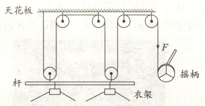 4. 某款“手摇晾衣架”的简化结构图如图所示,晾晒衣服时转动摇柄,衣架平稳上升。小张在家用2个衣架晾晒一床重20 N的被子,被子在10 s内竖直匀速提升了1 m。已知摇柄对绳子施加的拉力F=10 N,每个衣架重1 N,每个滑轮重1 N,杆重1 N,不计摇柄与绳之间的摩擦,g取10 N/kg。在该过程中,下列说法正确的是 (