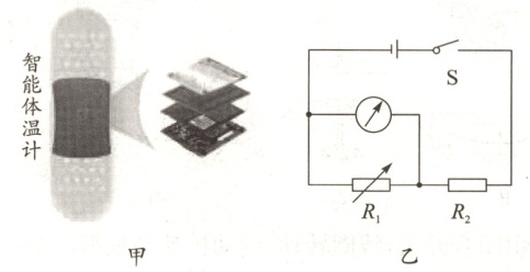 10. 小容受穿戴式“智能体温计”(如图甲所示)的启发,设计了一个如图乙所示的体温计电路图,用合适的电表(电流表或电压表)示数大小反映温度高低,热敏电阻R₁的阻值随温度的升高而增大,定值电阻R₂起保护电路的作用。下列分析正确的是 (