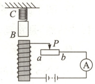 11. 如图所示,给电磁铁通电,铁块及弹簧在图中位置静止,当滑动变阻器的滑片向b端滑动时,关于电流表示数和弹簧长度变化情况是 (
