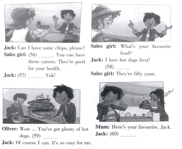 ( B) 看图, 根据对话内容, 从所给的选项中选择恰当的句子补全对话( 其中有两个多余选项)。