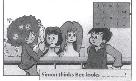 82. In the grid, cross out all the letters that appear more than one time. The remaining letters spell out what Simon thinks Bee looks like in that wig (假发)! (写出单词的小写形式)