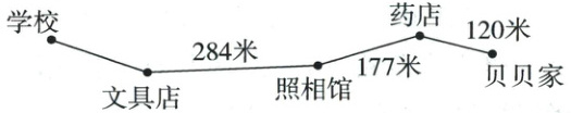 (2)贝贝家到学校一共有750米,文具店到学校有多少米?(画一画,算一算)(6分)