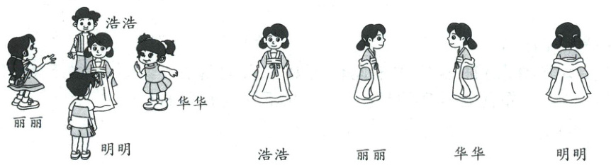 1. 下面是四名同学在汉服展上观看一名身穿汉服的同学的情景。他们看到的分别是哪幅图?(4分)
