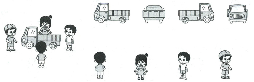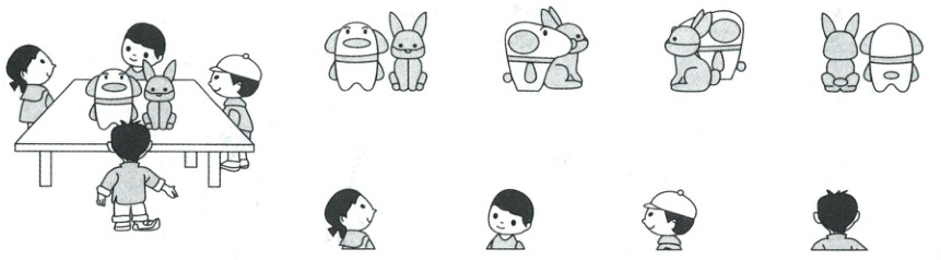 3. 四个小朋友在观察玩偶小狗和小兔,下面各图分别是谁看到的?(8分)