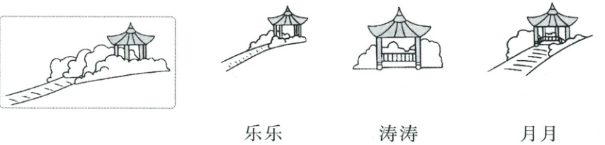 4. 星期天,乐乐、涛涛和月月一起去爬山,乐乐爬得最快,月月爬得最慢,在最后。下面三幅图分别是谁看到的?用线连一连。(6分)