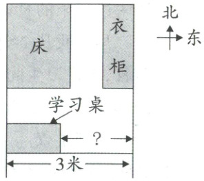 5. 爸爸给桃桃买了一张学习桌,桌面长12分米,宽7分米。摆放方式如图所示,学习桌距离东面墙的距离还剩(