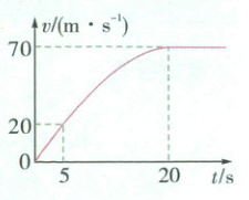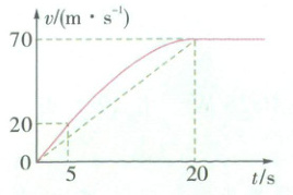 解 由题意和$ v - t $图像知,越野车速度最大时应有$ P_{ 额} = fv_m $,越野车受到的阻力为$ f = \frac{P_{ 额}}{v_m} = \frac{140 × 10^3}{70} \, N = 2000 \, N $,A正确;当越野车做匀加速运动时,由图像可知$ a = 4 \, m/s^2 $,当匀加速结束时由$ P_{ 额} = Fv $,$ F - f = ma $,越野车的质量为$ m = 1250 \, kg $,B正确;$ 0 \sim 20 \, s $内,若越野车全程匀加速至$ 70 \, m/s $,越野车的位移等于$ 700 \, m $,由图像面积可知题意中$ 0 \sim 20 \, s $内越野车的位移大于$ 700 \, m $,C正确;功率恒定时,由$ W = Pt $知$ 0 \sim 20 \, s $内越野车牵引力做功为$ 2800 \, kJ $,但匀加速启动过程中功率小于额定功率,则越野车的牵引力做功小于$ 2800 \, kJ $,故D错误。故不正确的选项为D。