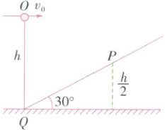 8.(2024·周口期中·知识点2)两探险队员在探险时遇到一山沟,山沟的一侧竖直,另一侧为倾角$30°$的斜坡,山沟两侧在底部相交于$Q$点。一队员从山沟的竖直一侧$O$点,以某一初速度沿水平方向抛出一个小球,小球落在斜面上$P$点,如图所示。已知$O$点距离斜坡底部高度为$h$,$P$点到斜坡底部竖直距离为$\frac{h}{2}$。忽略空气阻力,重力加速度为$g$。
