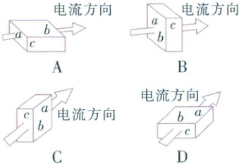 有一个材料分布均匀的长方体金属,边长分别为$ a $、$ b $、$ c $,且$ a > b > c $。在金属两端加以相同电压,电流沿以下方向流过该金属,则电流最大的是()。