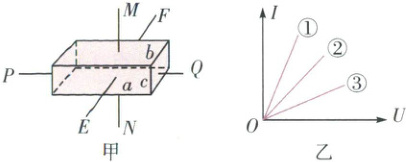 7.B 【解析】根据电阻定律$R = \rho\frac{l}{S}$,导体通入沿PQ方向的电流时,电阻$R_{1} = \rho\frac{a}{bc}$,通入沿EF方向的电流时,电阻$R_{2} = \rho\frac{b}{ac}$,通入沿MN方向的电流时,电阻$R_{3} = \rho\frac{c}{ab}$,由题意知$a > b > c$,则$R_{1} > R_{2} > R_{3}$,$I - U$图像的斜率为$\frac{1}{R}$,由题图乙可得导体通入沿PQ方向的电流时导体的伏安特性曲线为③,通入沿EF方向时导体的伏安特性曲线为②,通入沿