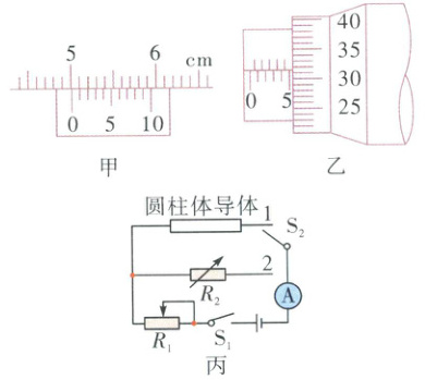 (1)分别使用游标卡尺和螺旋测微器测量圆柱体导体的长度和直径,某次测量的示数如图甲、乙所示,长度为