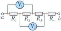 如图所示电路中,电压表 $V_1$ 和 $V_2$ 的内阻都远远大于 $R_1$、$R_2$、$R_3$ 和 $R_4$ 的电阻。$R_1$ 和 $R_3$ 电阻未知,$R_2 = R_4 = 20\ \Omega$,电压表 $V_1$ 和 $V_2$ 的读数分别为 $15\ V$ 和 $10\ V$,则 $a$、$b$ 两点间的电压为()。