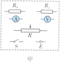 (1) 要求通过$ R_x $的电流可在$ 0 \sim 5\ mA $范围内连续可调,将图甲所示的器材符号连线,画出实验电路的原理图。