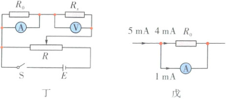(2) 电路中$ R $应选最大阻值为$ 10\ \Omega $的滑动变阻器,方便电路的调节,测量效率高、实验误差小。通过$ R_x $的电流最大为$ 5\ mA $,需要将电流表量程扩大为原来的$ 5 $倍,根据并联分流的规律得示意图如图戊所示,并联电路中电流之比等于电阻的反比,可知$ \frac{4\ mA}{1\ mA} = \frac{300\ \Omega}{R_0} $,解得$ R_0 = 75\ \Omega $。